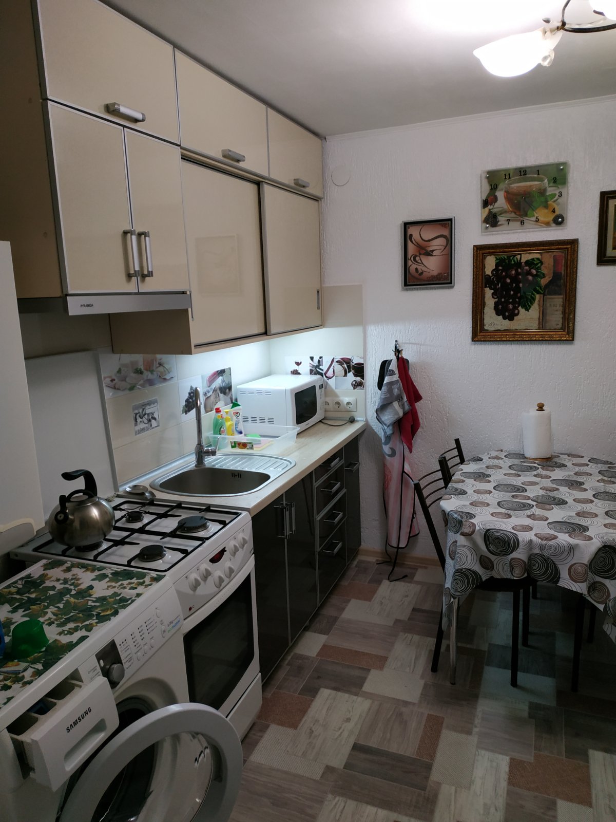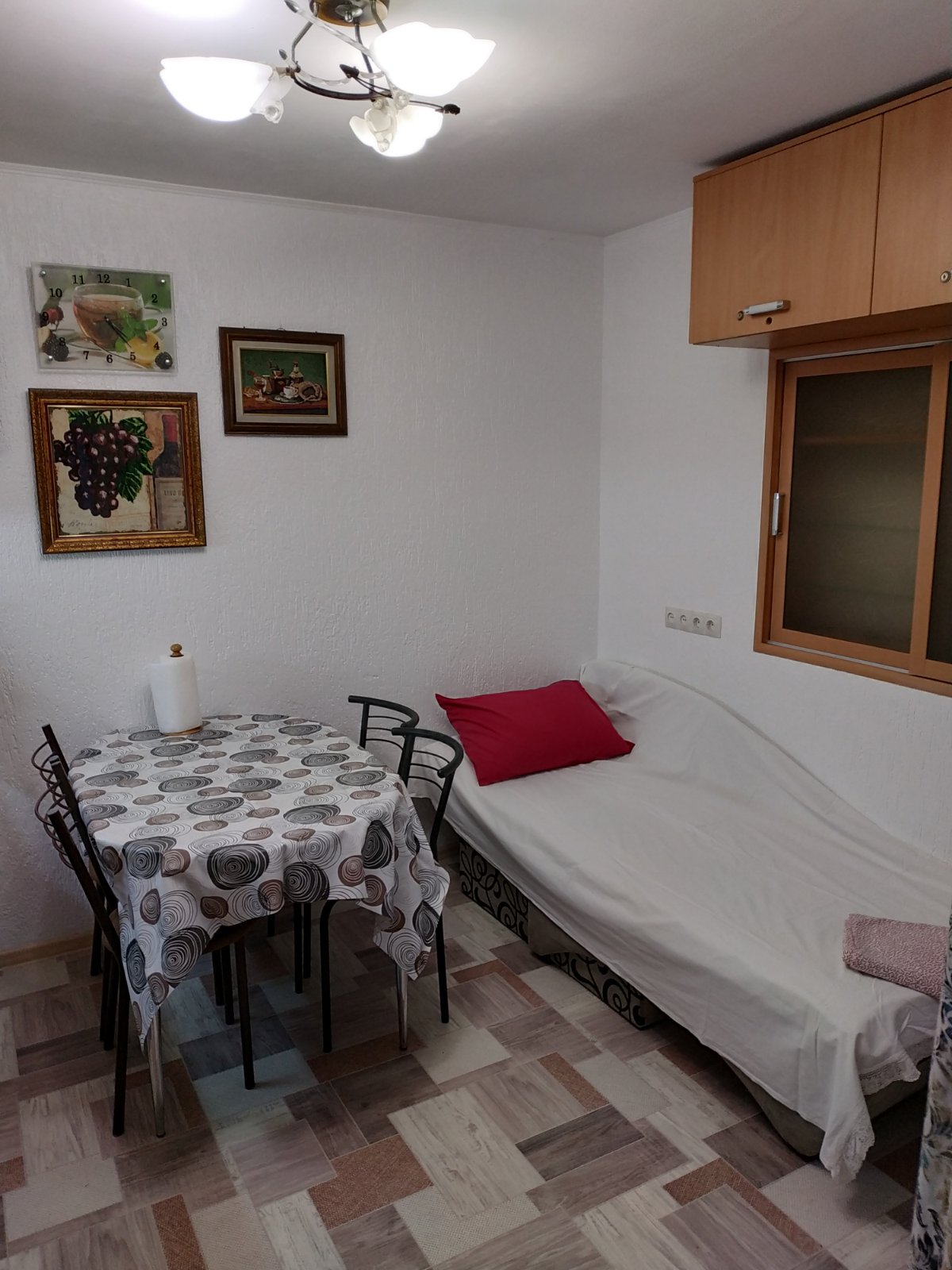 Дом расположен на берегу моря и его двор выходит на набережную и пляж . В доме одна комната и кухня есть ванна и туалет .
