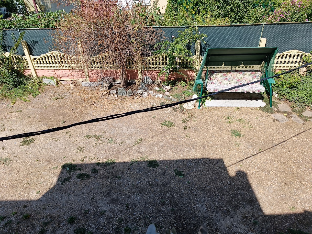 — закрытый двор без хозяев, где есть мангал, качалка, место для машины, зона для отдыха с стульями и столиком.